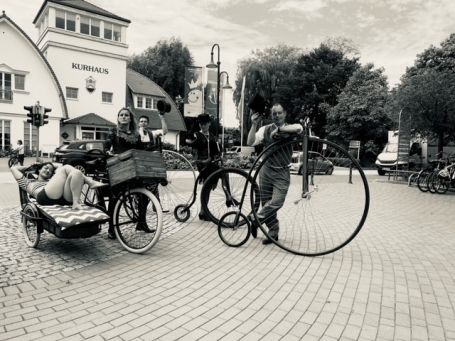 Mit einem vielfältigen Programm ziehen die Kleinkünstler*innen durch die Eutiner Innenstadt und sorgen mit ihrer mobilen Bühne für Unterhaltung.