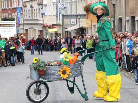 Imanuel Immergrün, der Gärtner in Übergröße, erkundet gemeinsam mit den Kindern als Walk Act die Straßen Eutins. Immer mit dabei ist sein immergrüner Garten in der Schubkarre.